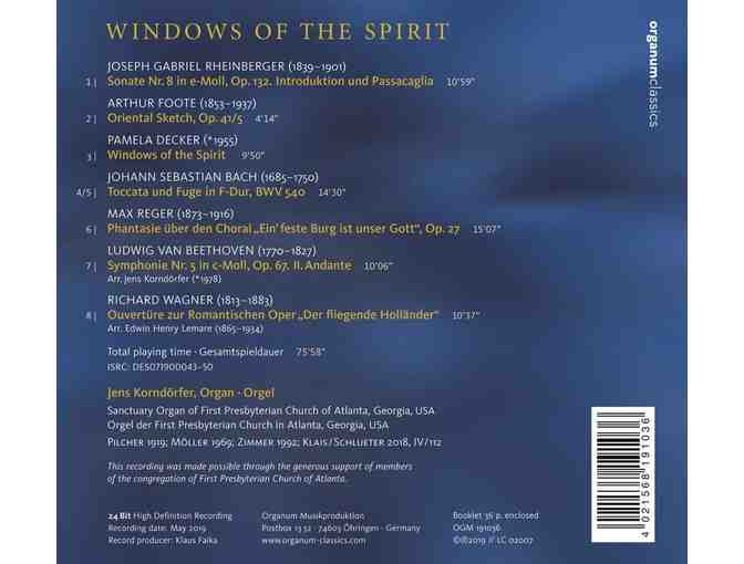 First recording on the renovated & enlarged Klais/Schlueter organ (IV/112) at First Presbyterian Church of Atlanta. Jens Korndörfer, Organ Wagner - The Flying Dutchman (Overture, arr. by Lemare) Beethoven - Symphony No. 5 in c minor, op. 67 (II. Andante, arr. by Korndörfer) Reger - Choralfantasie über ÂÂÂEin feste Burg ist unser GottÂÂÂ, Op. 27 Foote - Oriental Sketch, Op. 41/5 Pamela Decker - Windows of the Spirit Commissioned by First Presbyterian Church of Atlanta J.S. Bach - Toccata und Fuge in F-Dur, BWV 540 Rheinberger - Sonate Nr. 8 in e-moll, Op. 132 (Introduction und Passacaglia) Organum Classics OGM 191036