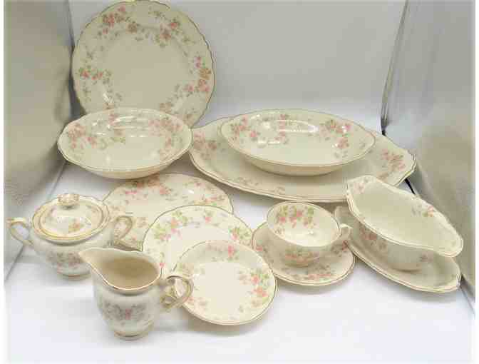 A set of Syracuse Fine China, Stansbury pattern, Federal shape. Ivory in color with delicate floral design in pink, green and gray. This elegant vintage tableware features a scalloped rim and gold trim - a pattern that will look timeless on any table. Made in America and vintage from 1950s, the design is now retired.