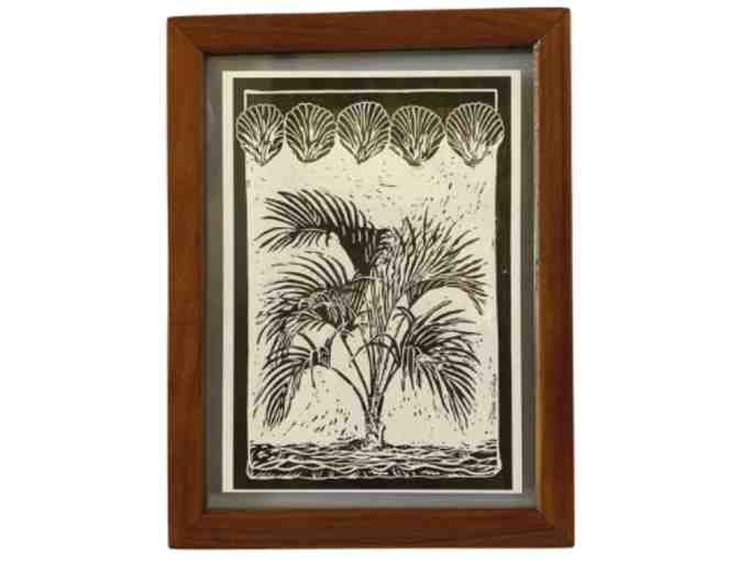 Koa framed Kentia Palm Print from Lord Howe Island (scene of the recent NTBG expedition). Measurements: length 14 3/4 width 11 1/8