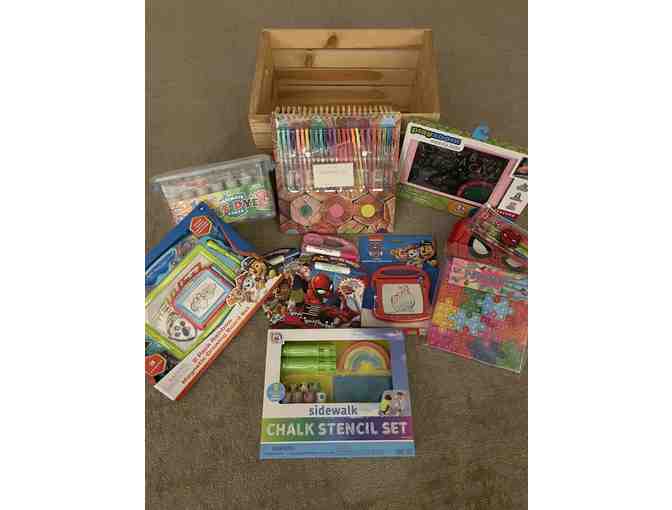 A crate filled with assorted arts and crafts tools and projects. The package includes Chalk stencils, colored pens, a doodle pad, and much much more. Great for your grandkids or kiddos who love to draw and color.