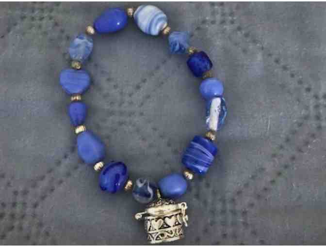 This pretty blue bracelet is 4" long with a 3.75'' stretch cord (circumference 7.5"). The prayer box opens for you to insert a small written prayer.