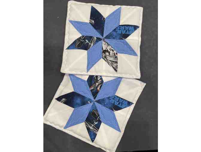 Two hand knitted blue and Star Wars pot holders