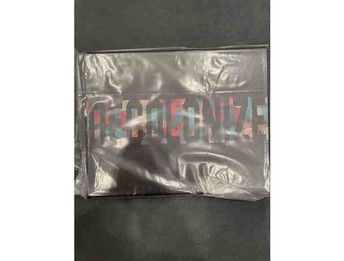 Black background with colorful DECOLONIZE printed canvas