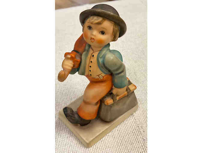 This lovely figurine of a boy walking with satchel and umbrella is 5" tall. Has TMK3 - West Germany mark.