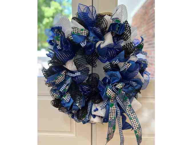 Handmade Door/Wall Wreath with Colors of Blue, White, Black and accents of Green