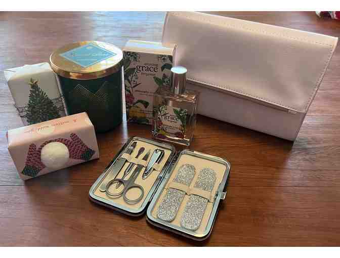 This Package Includes a Mila Pink Journal Clutch - Dark Green Spiced Pear Candle - 2 Speciality Soaps, Sugar Cookie and Evergreen - Philosophy Amazing Grace Bergamot Fragrant Spray - Pink Travel Size Manicure Set