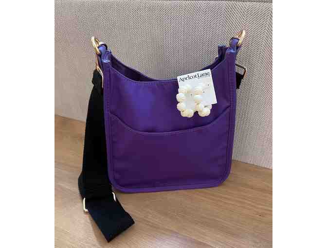 Canvas Purple Shoulder Bag with Cream Ball Earrings