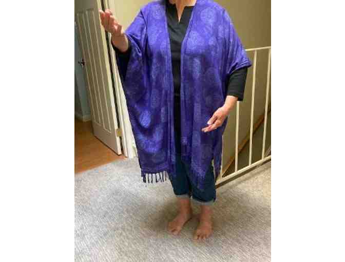 When wearing this 'One Size Fits All' handmade shawl, you will feel surround by energy. It is 100% Rayon and may be washed in cold water. It has a seam under the arm to the 2 1/2" fringe.