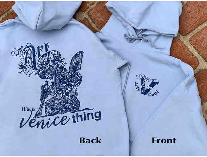 One MEDIUM light blue quality hoodie sweatshirt with dark blue printing. Front features the Venice High Arts Guild (VHAG) logo, the back features "Art it's a Venice thing" graphic. Graphic Artist, Nan Chorpash has intricately layered small stories within the larger design. These represent both Venice High and many of the Arts supported by the VHAG. See how many you can find.