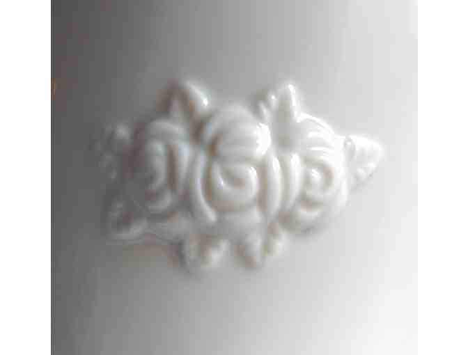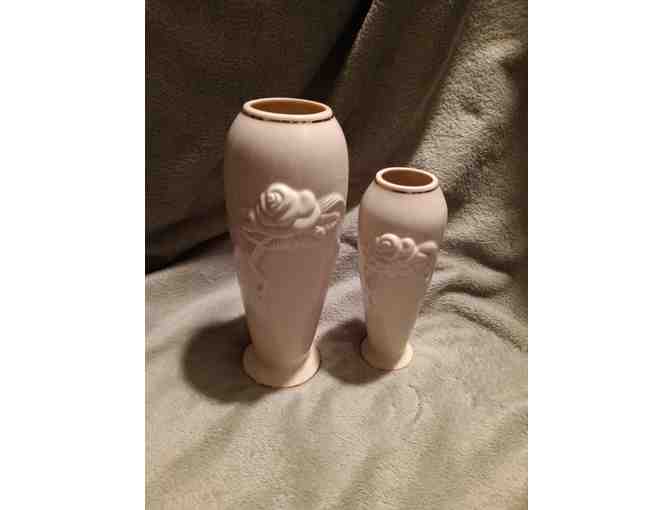Vintage Lenox Rose Blossom Embossed Bud Vase Porcelain 24k Gold Trim. One- 7.5" and the other 5.75". Both share the same embossed rose on the front and a smaller bouquet on the back.