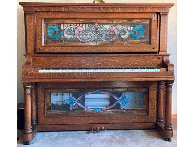 SOMEONE'S GOING TO LOVE THIS ITEM! The piano is in excellent condition and has a gorgeous tone. As you can see from the photos its cabinet style has beautiful stained glass. The wood is medium brown satin oak. It has been in the donor's family for at least 31 years.