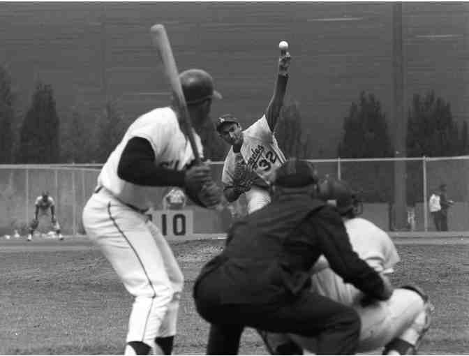 Sandy Koufax of the Los Angeles Dodgers pitches to San Francisco Giants center fielder Willie. Mays at Candlestick Park.