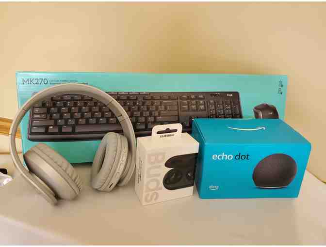 A basket full of tech items to keep you connected! Includes a wireless keyboard & mouse, Samsung Galaxy Buds, an Echo Dot, wireless headphones and an Axess Bluetooth Speaker.