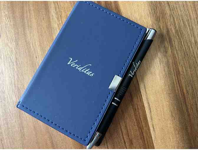 You couldn't have a handier tool tucked away in your pack than this little notebook. Navy blue journal(with white inscribed Veriditas logo), and Black pen (also adorned with a white Veriditas logo). Opens to a blank white pad on one side, and an assortment of sticky notes and arrows in a variety of colors on the other side.