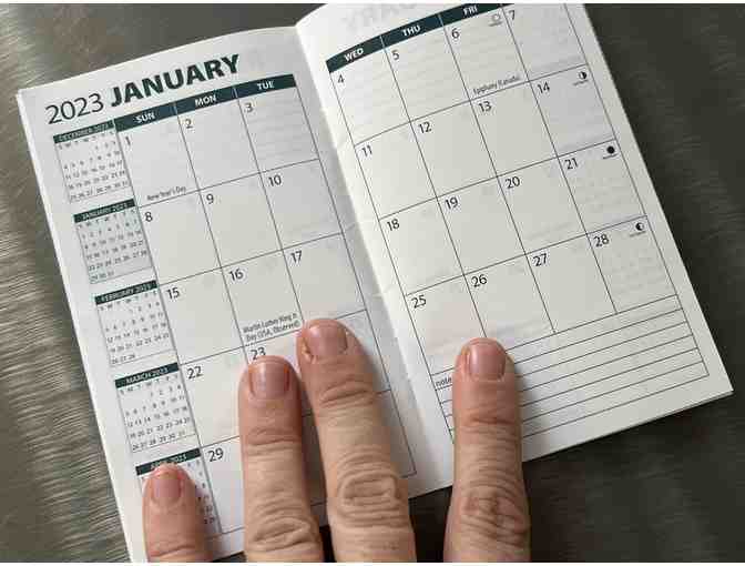 Small Paper Pocket Calendar, with the Veriditas mailing address and phone number for easy reference.  Includes a small ruler and metic chart on the back interior cover for quick conversions and measurements.  Bidding starts at $1.00