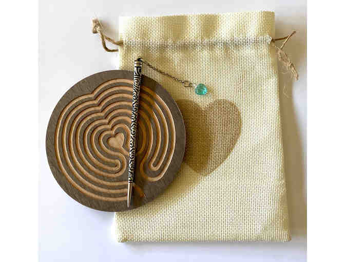 Polished metal stylus with AQUA glass heart perfectly compliments the driftwood color on this labyrinth. Smooth pathway allows polished end of stylus to glide along on your "walk"