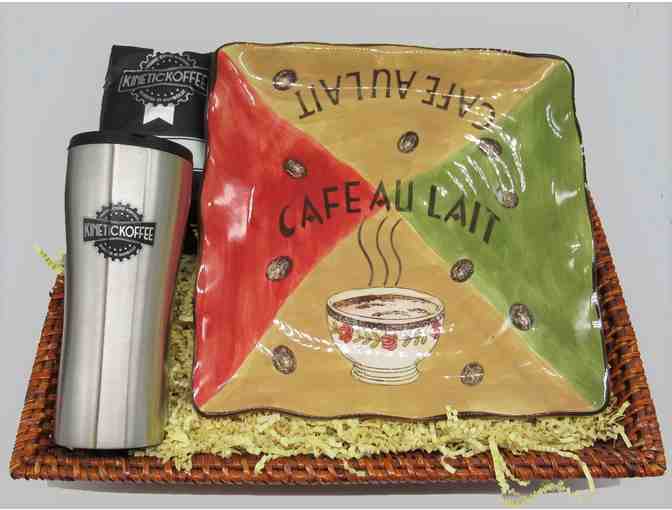 This Kinetic Koffee Company set includes a beautiful and useful platter in red, yellow and green. The platter is 11" by 11" has a slightly scalloped edge and has "Cafe Au Lait" painted on it. The travel coffee cup is aluminum and has a screw top lid and a very tight fitting snap top giving you access without spillage. Also included is 12 ounce bag organically grown roasted coffee! It is called Honduras Gea, Women Grown, Medium. The description is Floral, Grape, Herbal, Smooth and is a limited edition micro roast. Sounds like something most anyone would like to wake up to.