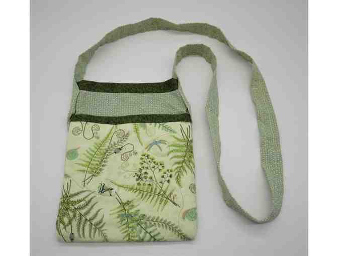This beautiful handmade purse was created from repurposed cotton fabrics.  It has handy pockets with velcro closures to keep things in this small purse organized. It has three different but coordinating fabrics in shades of green. The base is lightly machine quilted and the fabric has an outdoor motif. There are ferns and branches as well as insects such as a dragonfly, grasshopper, snail and a ladybug. There is a center compartment that has a snap closure and it has a shoulder strap. Great for when you don't want to bring a big purse but large enough for your phone and other essentials.
