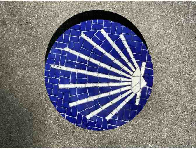 Photo of a Camino de Santiago pilgrimage sign from the streets of Chartres, France. Mounted on 5" metal disk with hanger hardware on the back.