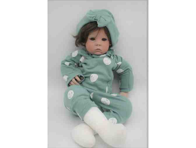 Exquisite craftsmanship and a love of dolls led to the creation of this adorable porcelain baby doll. Dressed in a cute mint green outfit with a headband, she has brown German glass eyes and is made from a head mold designed by famous dollmaker, Tyner. Designed and handmade by local Big Lagoon resident Jackie Tidwell. The doll measures 21" in length. She had an injured finger which has been repaired.