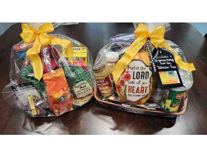 Included in these dual baskets are all the fixings needed to create a delicious Thanksgiving Turkey Dinner. Use the baking pan to cook the 23 pound free range turkey raised locally at Dan & Shelley Johnson's farm. Make all the included side dishes and if there is anything else you need, use the $100 Walmart Gift Card to purchase them.