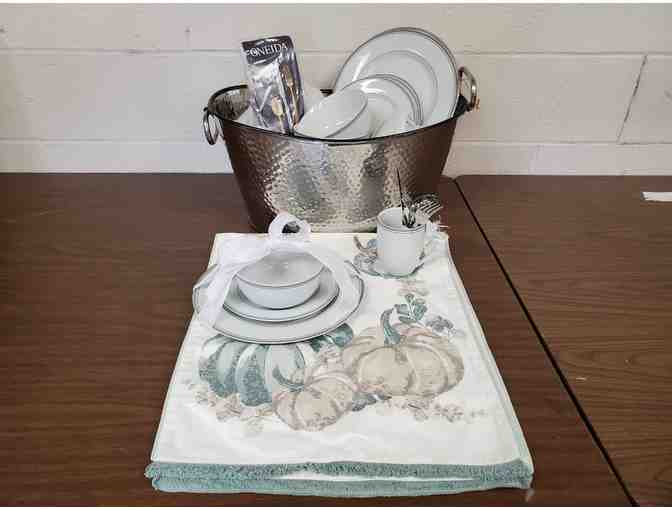 All the rage this season, blues and metallics in Fall motifs. Update your dinners with the beautiful pumpkin table runner and matching 4 piece dinnerware and 5 piece Oneida stainless silverware (4 sets of each). These are nestled in a pounded finished tub, perfect for entertaining.