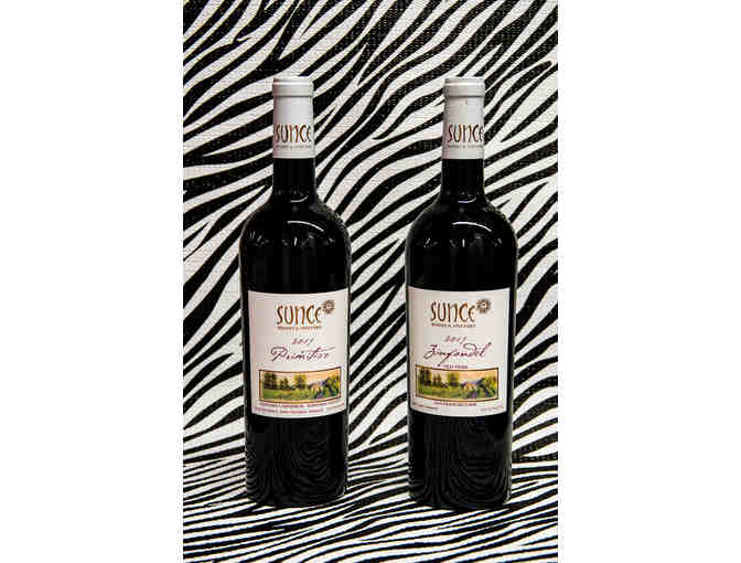 Two beautiful bottles of red wine! 2019 Sunce Old Vines Zinfiandel 2019 Sunce 14 Barrels Primitivo Sunce is a family winery located in the Russian River Valley of Sonoma County. They specialize in small artisan lots of vineyard designated varietals and classic blends.