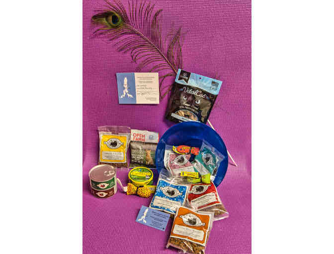 Blue basket full of cat treat, toys and food to make your little kitties heart so happy! Set includes: $5 Island Animal gift certificate Large blue plastic bowl Variety of canned food Feather wand toy Cat treats