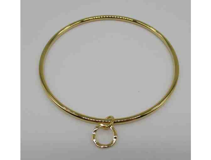 Slim bangle braclet with small round dangling charm. A delicate addition to your wrist by itself or added to a collection of bracelets. Holly Yashi's gold bracelets are gold inlay.