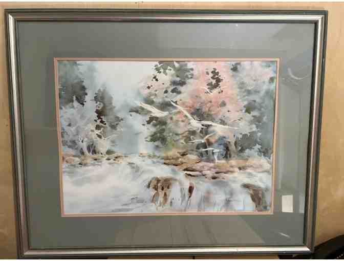 Beautiful picture of seagulls drifting on air. This is a framed giclée print 36 inches wide by 28 inches high. This print delivers a vivid image with maximum color accuracy and exceptional resolution.