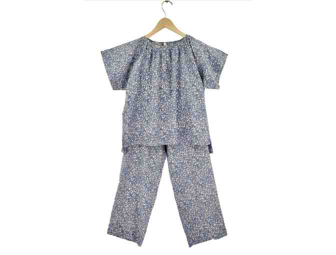 This pajama pant set contains a matching top and pants that comes packed in a matcing cotton pouch.It includes an elastic waist and is 100% cotton, hand panel printed by master printers in Bagru, India.This set also comes with a lightweight 100% cotton robe packed in a cotton pouch with side seam pockets, belt, and loops.