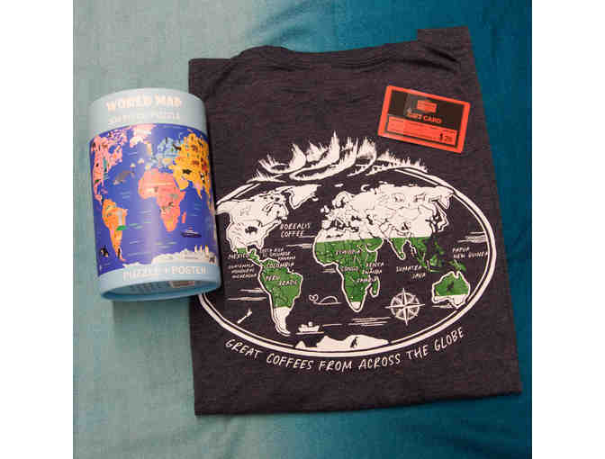 $20 gift card to Borealis Coffee Company Two Locations: 500 Wood Street, Unit 113, Bristol, RI. 250 Bullocks Point Ave, Riverside, RI 02915 https://www.borealiscoffee.com/ "Great Coffees from Across the Globe" men's t-shirt size large World Map puzzle