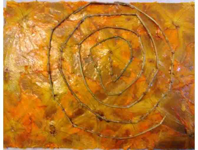 9x12 cardboard covered with dried pumpkin flowers with a thyme stem spiral labyrinth.