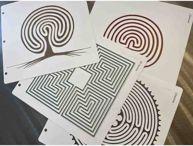 Four labyrinth designs which help provide access to labyrinths to those who are visually impaired. This listing is for 4 tactile labyrinths embossed on vinyl sheets with the raised labyrinth paths in color, so it’s appealing to people who are visually impaired or sighted. They are hole-punched to fit in a binder for easy transport and use. Included labyrinth designs are: