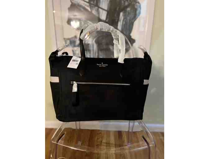 Kate Spade black nylon weekender bag with calf leather handle and details.