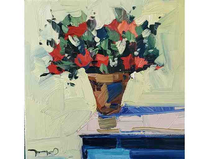 Gorgeous floral still life! Original and signed oil painting. 12 inches by 12 inches on stretched canvas. Artist: Jose Trujillo. Picture this wonderful painting on your wall, or as a fabulous holiday gift!