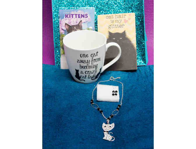 Crazy Cat Lady mug, cat necklace with ear rings, 2-year pocket calendar, small "Cat hair is my glitter" wooden sign