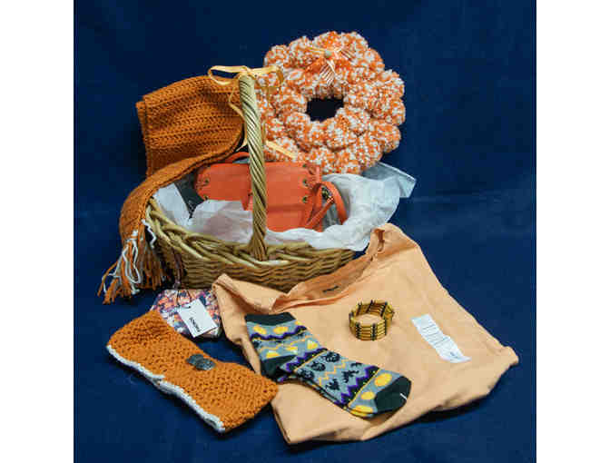 Burnt orange knit scarf Burnt orange knit head band Burnt orange handbag Cat socks Orange pom pom wreath Wooden bracelet Orange t-shirt - size large Sonoma wallet