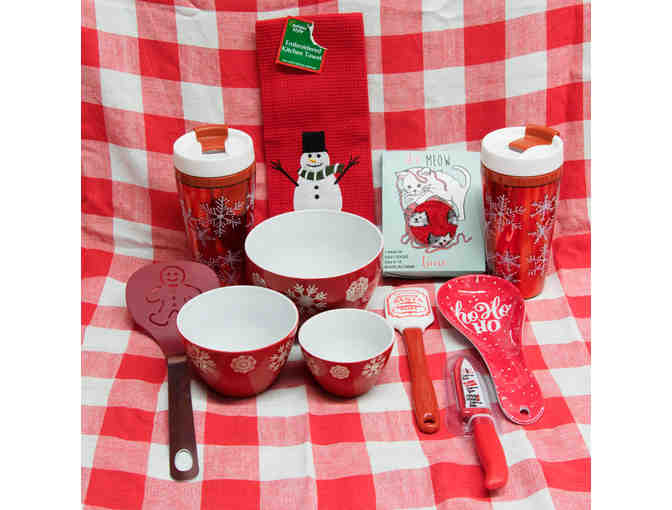 Snowflakes and red houseware set! 3 snowflake bowls, Snowman spatula, "Ho ho ho" spoon rest, Knife, 2 Red Snowflake tumblers, Snowman tea tow,el One pair "It's Meow" socks
