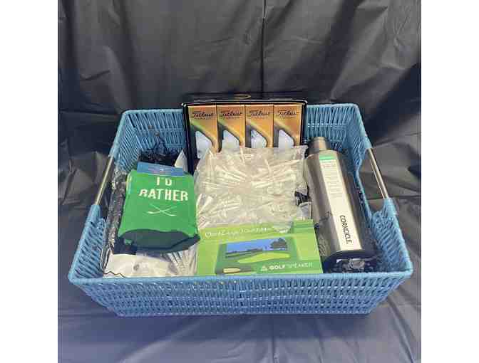 All you need is a tee time! Enjoy a golf speaker, golf towel & brush, a 16oz Corkcicle, golf themed socks, golf tees and a dozen ProV1 golf balls.