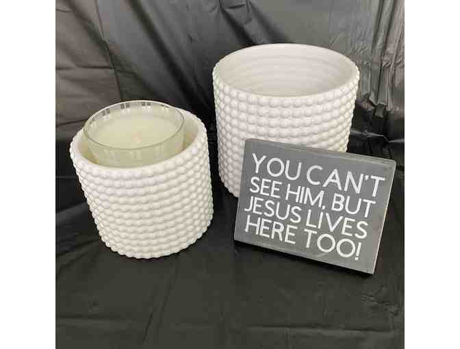 Bring calm into your home with a candle, succulent pots and a reminder that Jesus is always present.