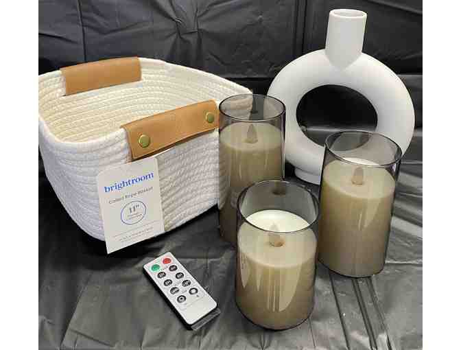 Home essentials! These flameless candels are one click away from setting a calming mood after a long day. Add this white vase and a decorative glass tabel tray to the warm mood of your living room space.