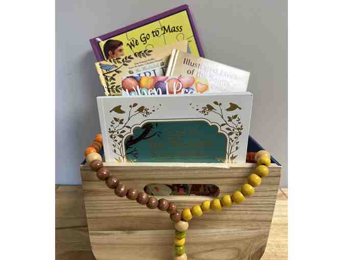 Essential religious children's books perfect to read before bed and evening prayer and a large Rosary perfect to help kids learn how to pray the Rosary.