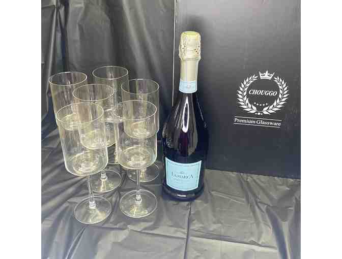 Beautiful and fun wine glasses that will add an extra "clink" to your toasting! This package also comes with a special glassware cleaning brush and a bottle of LA Marca Prosecco.