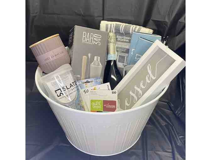 Enjoy a mixology set, Prosecco, $100 Visa Gift Card, $50 Starbucks Gift Card, $50 Darden Restaurant Gift Card, candle, Blessed sign, Slate Real Estate wine tumblers, koozie and pens, kitchen towels all in a fun beverage tub. Perfect for your kitchen or bar!