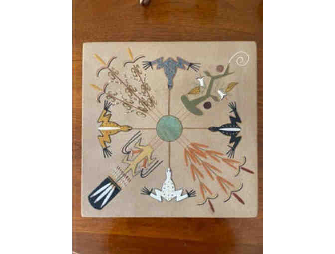 Sand paintings were traditionally used in healing or blessing ceremonies, created and destroyed in one day. In the late 1940s permanent sand paintings started to be made as art, using incomplete traditional symbols in a way that was not disrespectful, to share with the wider world and provide income.