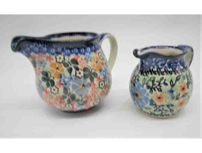 Set of two Polish Pottery stoneware creamers, 6oz and 8oz, with colorful floral designs handpainted by master artists of Ceramika Artystyczna, Maria Starzyk and Barbara Makiela. Signed.