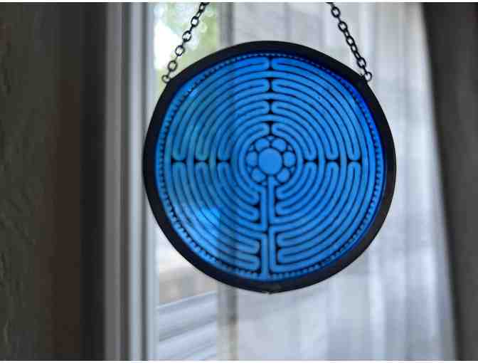 Hang on your a tree or garland during the holidays or display in a bright window year round! This hand pained glass window decoration was made in the borders of Scotland & Cumbria. Framed with traditional stained glass lead, and hung with a trace chain. Measures just over 2.5 inches in diameter.