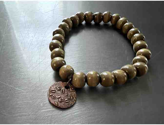 Beautiful stretchy light-weight wood bead bracelet with delicate copper colored charm.