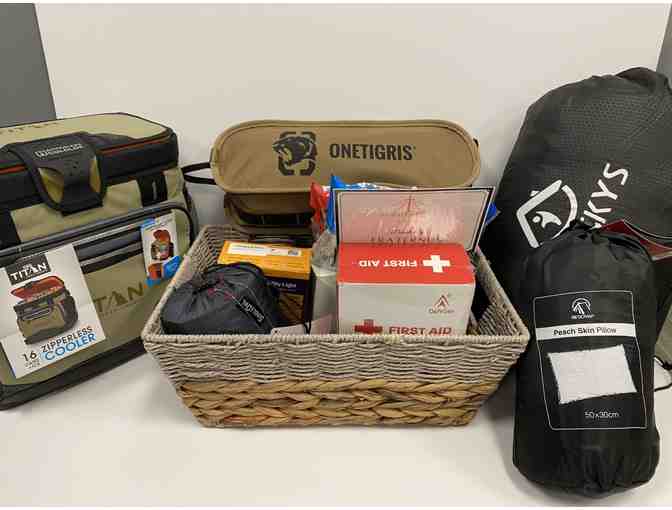 Perfect camping weather is upon us! This basket has all the extra items you may need, including a sleeping bag, pillow, cooler, First-Aid kit, and more!